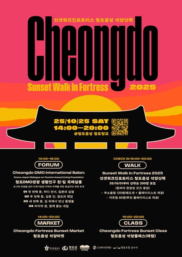 주요 프로그램으로는 △지역의 활력과 지속 가능한 지역 관광의 가능성을 높이기 위한 관(官), 기업, 시민 단체의 다양한 실행 사례를 발표하는 한·일 정책 포럼을 비롯해 △읍성 밟기를 현대적으로 재해석해 무소음 헤드셋을 착용하고 청도의 고즈넉한 밤 풍경을 감상하는 특별한 읍성 산책 △전기 자전거 투어, 굿즈 만들기 등 콘츄리 클래스 체험 프로그램 △지역 특산품과 수공예품을 만날 수 있는 청도읍성 석양마켓 등 다채롭게 구성해 방문객에게 색다른 즐거움을 선사할 것으로 기대된다.