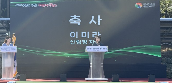 이미라 산림청 차장이 24일 경남 산림바이오 센터 개청식에 참석해 인사말을 하고 있다. ⓒ산림청