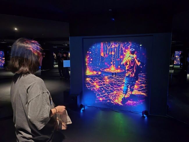 AR그래픽과 실내 조명이 어우러진 '용화향도 시즌2' 체험 공간에서 방문객이 몰입형 전시를 즐기고 있다. ⓒ 경주시