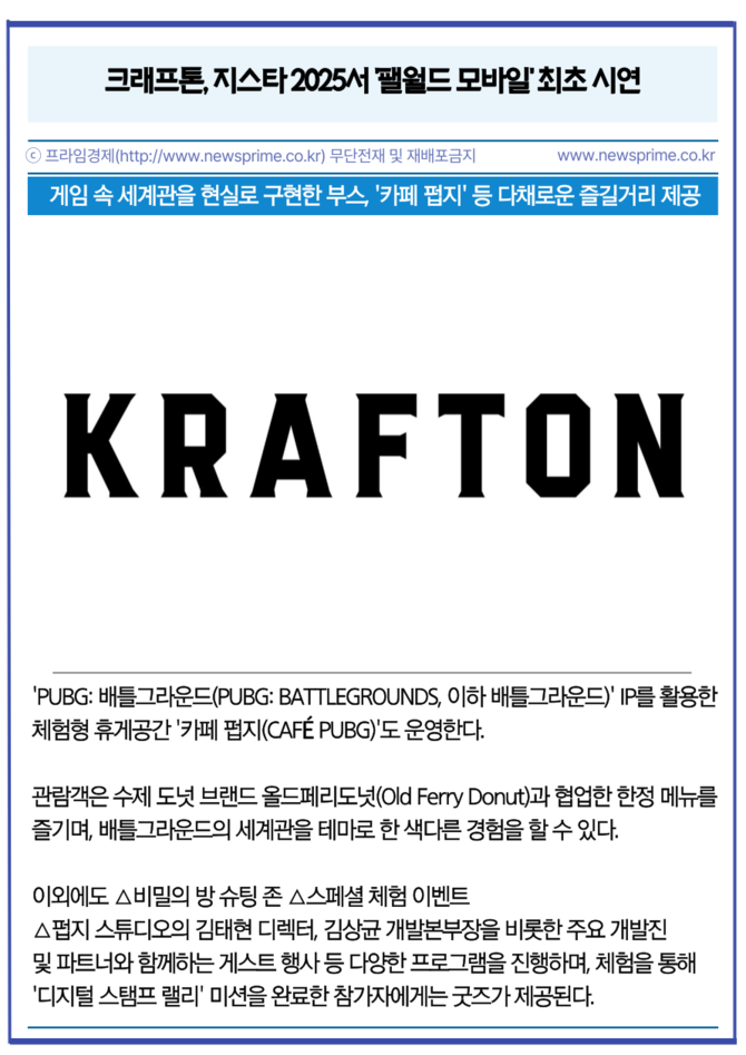 [프라임경제] 크래프톤(259960)이 오는 13일부터 16일까지 부산 벡스코에서 열리는 국제 게임 전시회 '지스타(G-STAR) 2025'에서 관람객을 위한 다양한 현장 프로그램을 운영한다.
