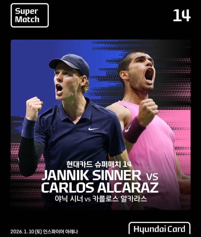 '현대카드 슈퍼매치'는 글로벌 톱 플레이어들을 초청해 스포츠와 문화를 결합한 프리미엄 이벤트로, 이번 14번째 매치는 현대카드의 브랜드 신뢰도와 기획력을 바탕으로 성사됐다. '현대카드 슈퍼매치 14 야닉 시너 VS 카를로스 알카라스' 티켓은 인터파크를 통해 구매할 수 있다. 현대카드 선예매는 오는 18일 정오부터, 일반 예매는 19일 정오부터 진행된다.