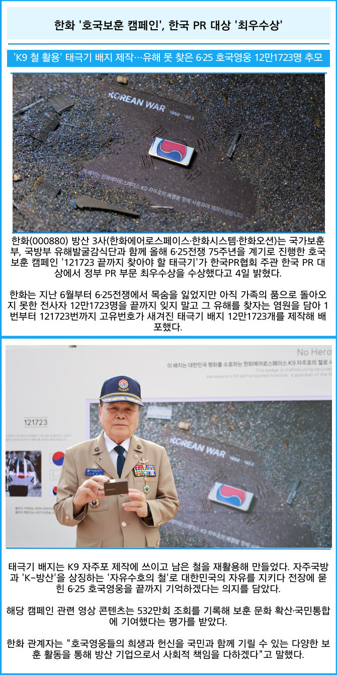 [프라임경제] 한화(000880) 방산 3사(한화에어로스페이스·한화시스템·한화오션)는 국가보훈부, 국방부 유해발굴감식단과 함께 올해 6·25전쟁 75주년을 계기로 진행한 호국보훈 캠페인 '121723 끝까지 찾아야 할 태극기'가 한국PR협회 주관 한국 PR 대상에서 정부 PR 부문 최우수상을 수상했다고 4일 밝혔다.