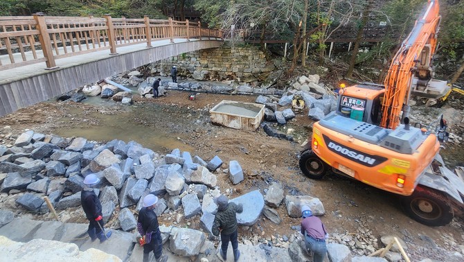 시는 낙석 위험이 있다고 판단해 집중호우 직후부터 출입을 전면 통제, 서산경찰서와 협력해 안전 조치를 취했다. 이후 국가유산청과 충청남도 등 관계 기관과의 현장점검을 거쳐 8월 초부터 긴급 복구를 추진, 계단 보수 및 교량 지대석 보강 작업을 실시했다.