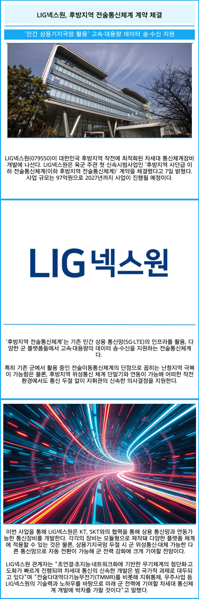 [프라임경제] LIG넥스원(079550)이 대한민국 후방지역 작전에 최적화된 차세대 통신체계장비 개발에 나선다. LIG넥스원은 육군 주관 첫 신속시범사업인 '후방지역 사단급 이하 전술통신체계(이하 후방지역 전술통신체계)' 계약을 체결했다고 7일 밝혔다. 사업 규모는 97억원으로 2027년까지 사업이 진행될 예정이다.