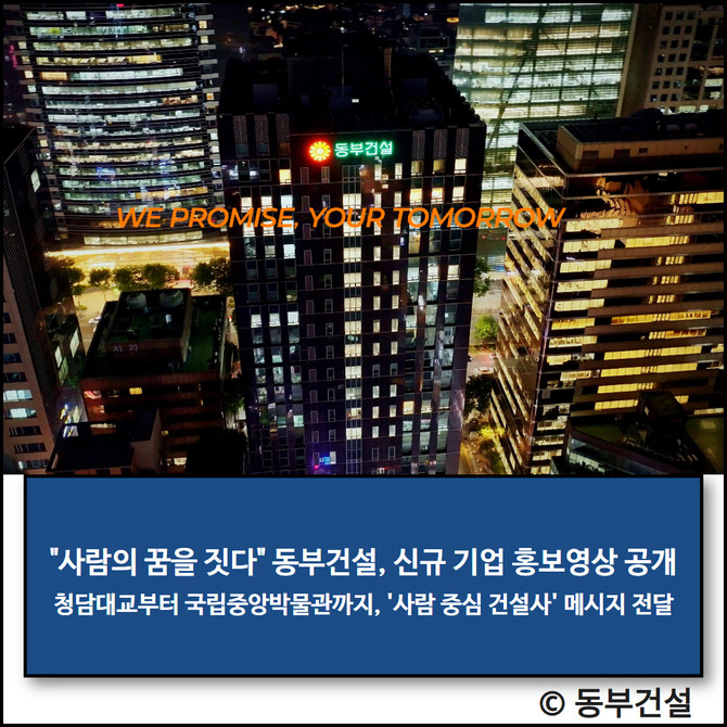 동부건설(005960)은 회사 핵심가치와 비전을 담은 신규 기업 홍보영상을 선보였다고 12일 밝혔다. 이번 영상은 기업 인지도와 브랜드 이미지 제고를 목표로 기획됐다.