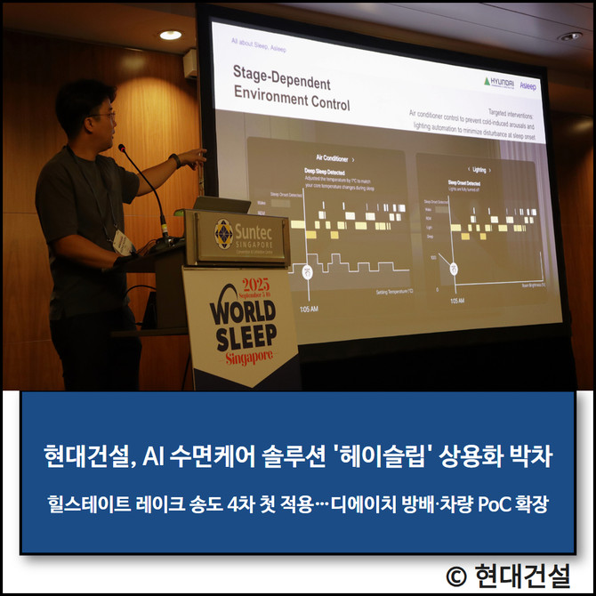 현대건설(000720)이 자체 개발한 AI 기반 수면케어 솔루션 '헤이슬립(Hey, Sleep)'을 공동주택 단지에 실제 적용하며 상용화에 박차를 가하고 있다. 주거공간을 넘어 센싱·AI 기반의 맞춤형 건강관리와 환경 제어를 융합한 '스마트 웰니스 리빙' 기술로 진화하며, 현대건설의 차별화된 주거 브랜드 전략인 '네오리빙(Neo Living)'의 핵심축으로 자리매김하고 있다.