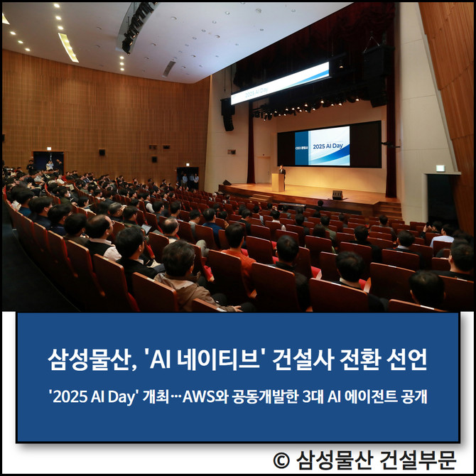 삼성물산(028260) 건설부문이 업무 전 영역의 인공지능(AI) 기반화를 선언하며 'AI 네이티브' 건설사로의 전환을 본격화했다. 삼성물산은 지난 11일 서울 강동구 본사에서 'AI시대, 건설을 새로 설계하다'를 주제로 '2025 AI Day'를 열고 전사 혁신 비전을 제시했다. 이날 행사에는 오세철 대표이사 사장을 비롯한 경영진과 임직원 400여명이 참석했다.