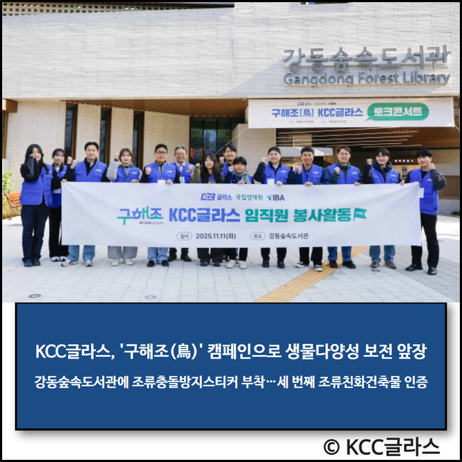 강동숲속도서관은 지난해 인증된 아차산숲속도서관과 매봉산숲속도서관에 이어 세 번째 '구해조(鳥) KCC글라스 조류친화건축물'로 지정됐다. 회사는 서울 구로구 천왕산 책쉼터에도 조류충돌방지스티커를 부착해 네 번째 인증 건축물로 추가했다.