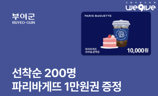 이번 이벤트는 고향사랑기부 문화 확산과 연말 기부 분위기 조성을 위해 마련된 것으로, 민간 플랫폼 '위기브'를 통해 부여군에 10만원 이상 기부한 사람 중 선착순 200명에게 파리바게뜨 1만원권 기프티콘을 제공한다.