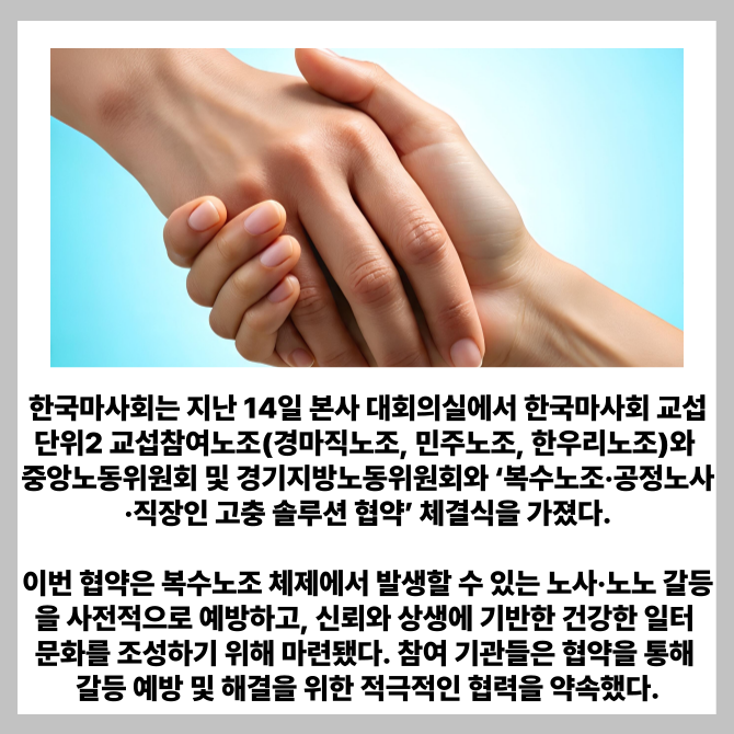 [프라임경제] 한국마사회(회장 정기환)가 노동위원회와 협력해 복수노조 간 갈등과 직장 내 고충 문제 해결에 나선다고 17일 밝혔다.