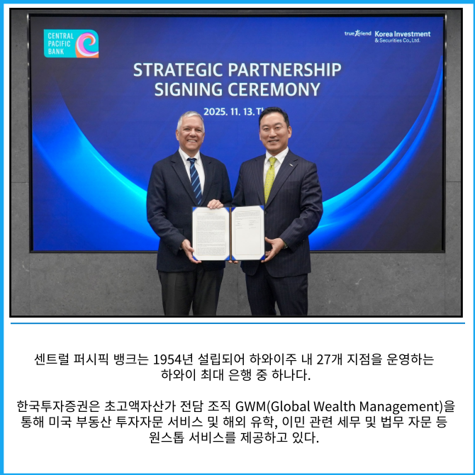 [프라임경제] 한국투자증권은 하와이에 위치한 '센트럴 퍼시픽 뱅크(CENTRAL PACIFIC BANK)'와 초고액자산가 대상 서비스 확대를 위한 업무협약(MOU)을 체결했다고 17일 밝혔다.