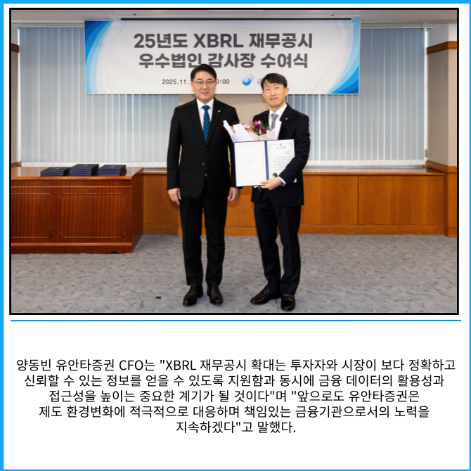 [프라임경제] 유안타증권(003470)은 20일 금융감독원으로부터 국제표준 데이터 기반 재무공시(XBRL, eXtensible Business Reporting Language)를 성실히 수행한 공로를 인정받아 재무공시 우수법인으로 선정돼 감사장을 수여받았다.