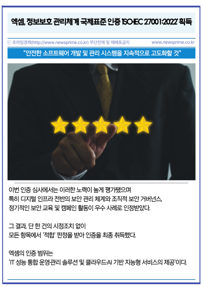 [프라임경제] 인공지능(AI) 기반 IT 성능 관리 전문 기업 엑셈(205100)이 국제표준화기구(ISO)와 국제전기기술위원회(IEC)가 공동 제정한 정보보호 관리체계 국제표준 인증인 'ISO·IEC 27001:2022'를 획득했다고 21일 밝혔다.