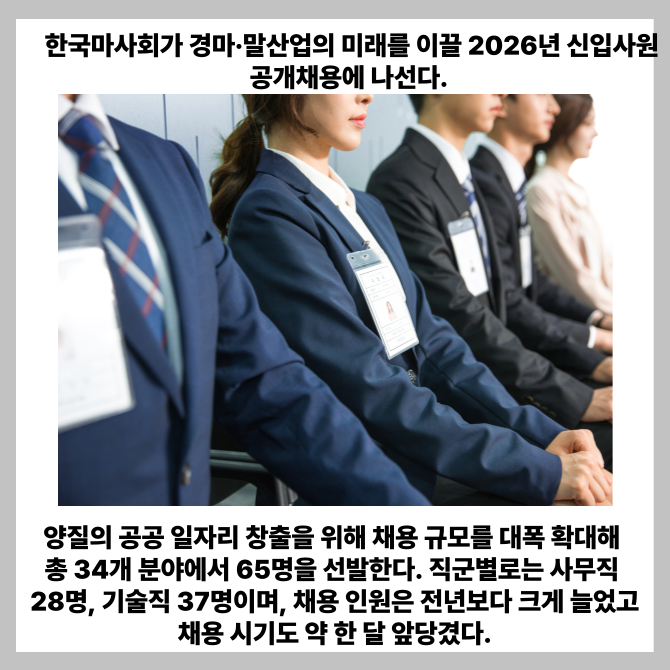 [프라임경제] 한국마사회(회장 정기환)가 경마·말산업의 미래를 이끌 2026년 신입사원 공개채용에 24일부터 나선다.