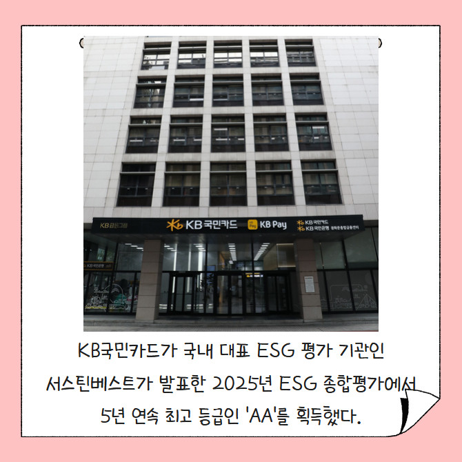 [프라임경제] KB국민카드가 국내 대표 ESG 평가 기관인 서스틴베스트가 발표한 2025년 ESG 종합평가에서 5년 연속 최고 등급인 'AA'를 획득했다.