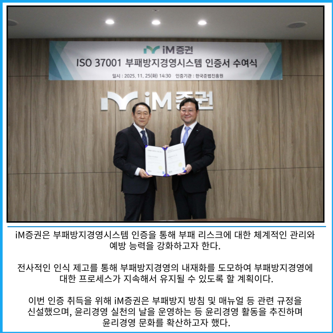 [카드] iM증권, 부패방지경영시스템 'ISO 37001' 인증 획득