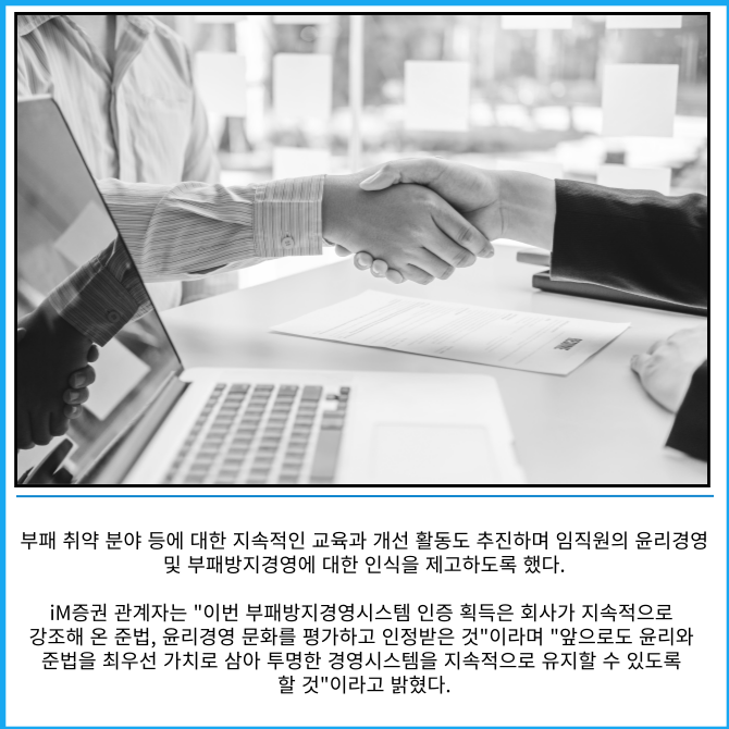 [프라임경제] iM증권은 한국준법진흥원으로부터 부패방지경영시스템인 ISO 37001 인증을 획득했다고 26일 밝혔다.