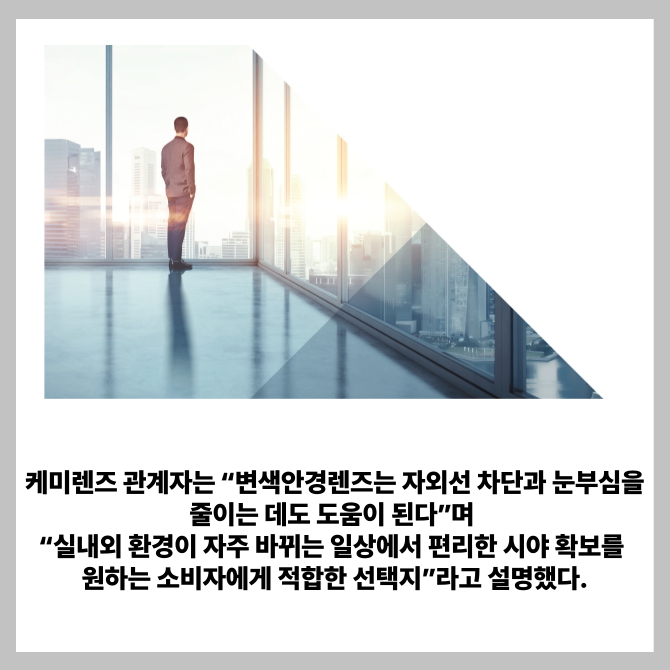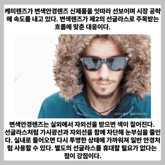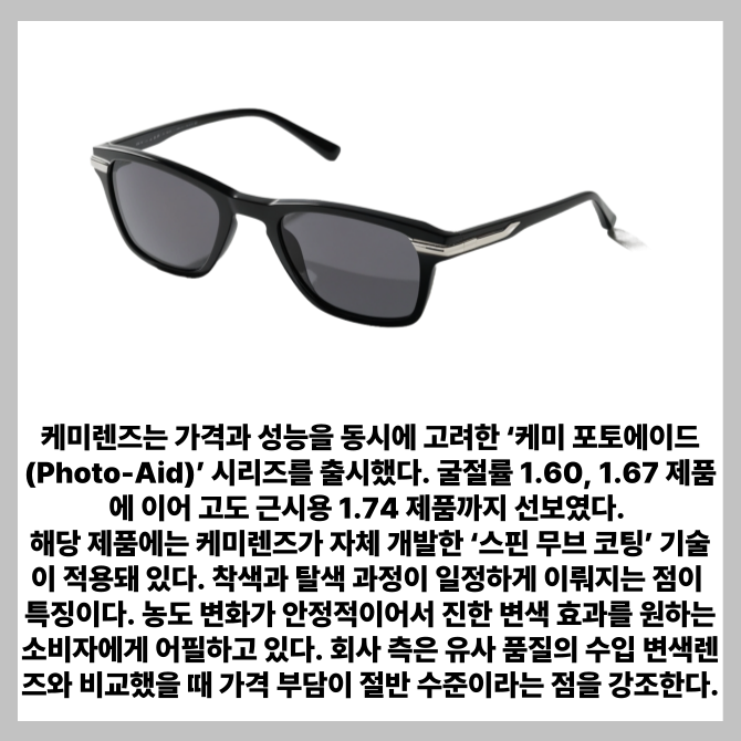 [프라임경제] 케미렌즈가 변색안경렌즈 신제품을 잇따라 선보이며 시장 공략에 속도를 내고 있다. 변색렌즈가 제2의 선글라스로 주목받는 흐름에 맞춘 대응이라고 26일 밝혔다.