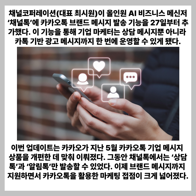 [프라임경제] 채널코퍼레이션(대표 최시원)이 올인원 AI 비즈니스 메신저 '채널톡'에 카카오톡 브랜드 메시지 발송 기능을 27일 출시했다. 이 기능을 통해 기업 마케터는 상담 메시지를 비롯한 카카오톡 기반 광고 메시지까지 한 번에 운영할 수 있게 됐다.
