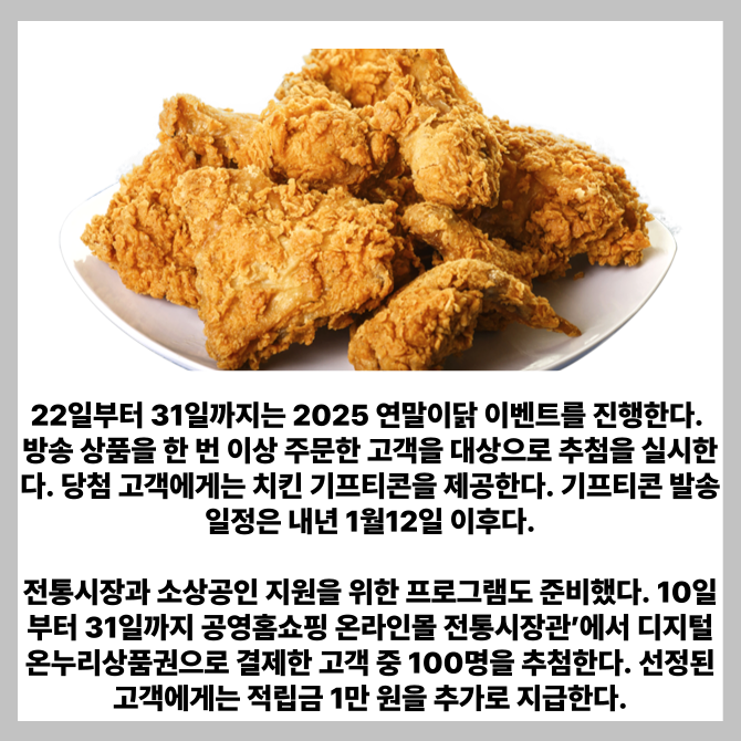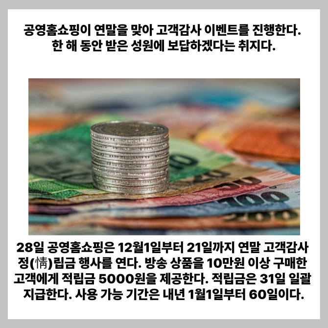 [프라임경제] 공영홈쇼핑이 연말을 맞아 고객감사 이벤트를 진행한다고 28일 밝혔다.