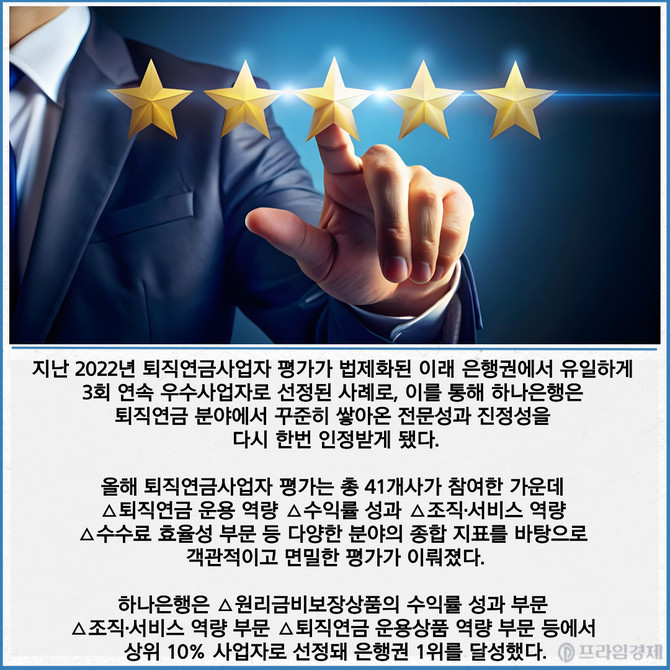 [프라임경제] 하나은행이 고용노동부가 주관하는 '2025년 퇴직연금사업자 평가'에서 은행권 우수사업자·고용노동부장관상 수상기관으로 3년 연속 선정됐다고 1일 밝혔다.
