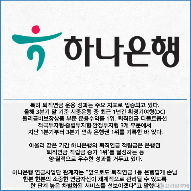 [카드] 하나은행, 퇴직연금사업자 평가 3년 연속 은행권 1위