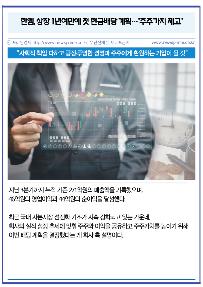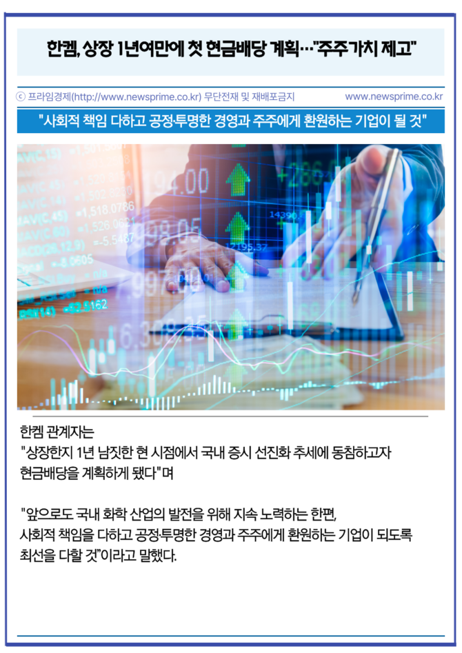 [카드] 한켐, 상장 1년여만에 첫 현금배당 계획…"주주가치 제고"