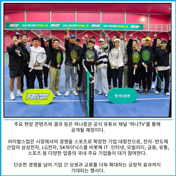 [프라임경제] 하나증권은 경기도 화성 테니스엠파이어에서 기업 대항 테니스 리그 '하나증권 2025 라이벌스컵'을 개막했다고 3일 밝혔다.