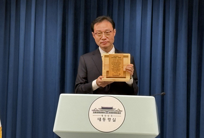 이규연 대통령실 홍보수석은 이날 용산 대통령실에서 "오찬은 1시간40분 동안 화기애애한 분위기 속에서 진행됐다"며 "본격적인 환담에 앞서 우원식 국회의장이 빛의 혁명 1년을 기리는 아주 특별한 기념패를 이재명 대통령에게 전달했다"며 기념패를 선보였다.