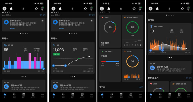 또 많이 사용한 기능 중 하나는 '바디 배터리 에너지 모니터링'으로 △심박수 △호흡 △HRV △ECG 등에서 확보한 데이터를 기반으로 컨디션에 대한 주관적인 느낌을 측정 가능한 데이터로 보여줘 하루 피트니스 수준과 운동 후 회복 상태를 더 잘 파악할 수 있도록 해 하루 라이프스타일을 챙길 수 있었다.