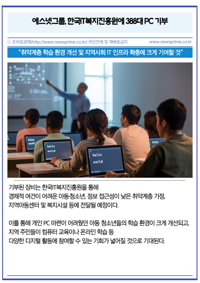 [프라임경제] 에스넷그룹은 한국IT복지진흥원이 진행하는 '사랑의 PC 보내기' 기부 행사를 통해 총 388대의 전산 장비를 기부했다고 4일 밝혔다.