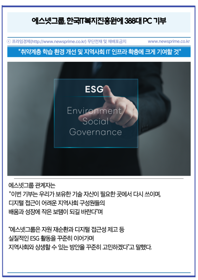 이번 기부는 에스넷그룹이 보유한 IT자산을 지역 사회에 환원하고, 교육 및 정보 접근성이 낮은 계층의 디지털 격차를 해소하기 위해 마련됐다. 특히, 자원 순환을 기반으로 한 환경보호와 디지털 학습·활용 기회 확대라는 ESG 경영 가치를 동시에 실천했다는 점에서 의미를 가진다.