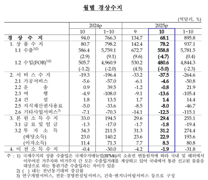 5일 한국은행(이하 한은)이 발표한 '2025년 10월 국제수지(잠정)'에 따르면 지난 10월 경상수지는 68억1000만달러 흑자를 기록했다.