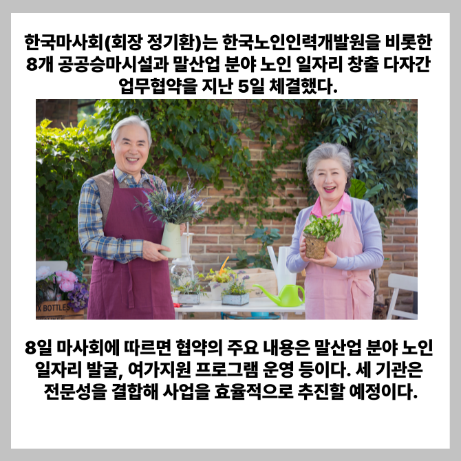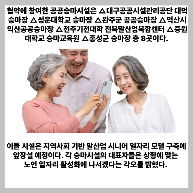 8일 마사회에 따르면 협약의 주요 내용은 말산업 분야 노인 일자리 발굴, 여가지원 프로그램 운영 등이다. 세 기관은 전문성을 결합해 사업을 효율적으로 추진할 예정이다.