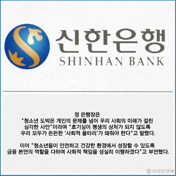[프라임경제] 신한은행은 청소년 불법도박 근절을 위한 릴레이 캠페인에 정상혁 은행장이 동참했다고 8일 밝혔다.