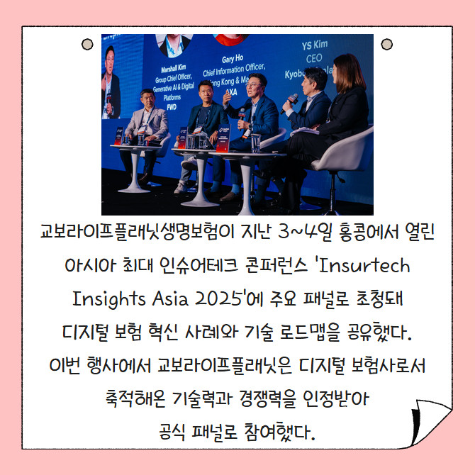 [프라임경제] 교보라이프플래닛생명보험이 지난 3~4일(현지시간) 홍콩에서 열린 아시아 최대 인슈어테크 콘퍼런스 'Insurtech Insights Asia 2025'에 주요 패널로 초청돼 디지털 보험 혁신 사례와 기술 로드맵을 공유했다. 이번 행사에서 교보라이프플래닛은 디지털 보험사로서 축적해온 기술력과 경쟁력을 인정받아 공식 패널로 참여했다.