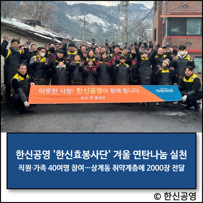 이번 봉사활동에는 한신효(孝)봉사단 임직원과 가족 등 40여명이 참여해 따뜻한 나눔 문화 확산에 동참했다. 참가자들은 주택가 골목을 직접 거닐며 약 2~3시간 동안 배정된 10가구에 각각 연탄 200장 씩, 총 2000장의 연탄을 지역 취약계층 가정에 전달했다.