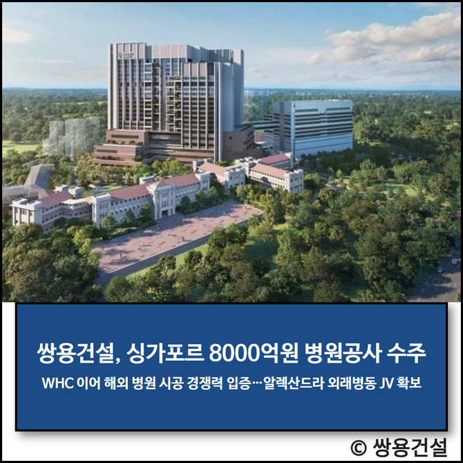쌍용건설은 미화 약 5억8000만달러(한화 약 8000억원) 규모 알렉산드라(Alexandra) 병원 외래병동(Outpatient Ward) 공사를 일본 시미즈건설, 싱가포르 킴리와 공동도급(JV)을 구성해 수주했다.