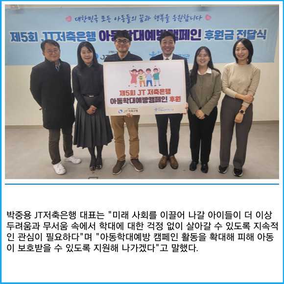 [프라임경제] JT저축은행이 지난 10월부터 진행한 '제5회 아동학대예방 캠페인'의 일환으로 경기도거점 아동보호 전문기관에 후원금 1500만원을 전달했다고 10일 밝혔다.