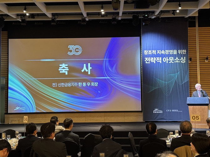 이윤철 산업정책연구원 부이사장이 제니엘그룹 30주년을 맞아 발간된 '창조적 지속경영을 위한 전략적 아웃소싱' 책의 발간 의도를 발표하고 있다. = 김상준 기자