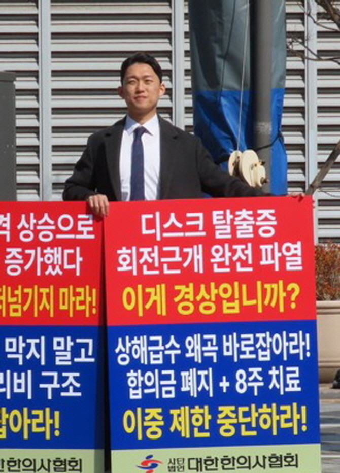 교통사고 피해자의 정당한 진료권을 침해하는 '8주 초과 치료 제한' 개정안을 즉각 철회해야 한다는 한의사들의 성토가 연일 이어지고 있다. 사진은 1인 시위를 펼치고 있는 최성규 한의사. © 대한한의사협회