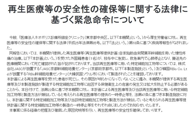 후생노동성은 도쿄 주오구 소재 '의료법인 네오폴리스 진료소 긴자 클리닉'으로부터 재생의료안전법 제18조에 따른 질병 등 발생 보고를 접수했다고 밝혔다.