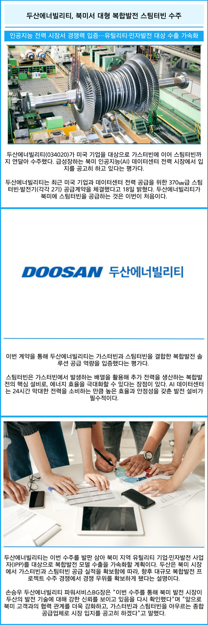 [카드] 두산에너빌리티, 북미서 대형 복합발전 스팀터빈 수주