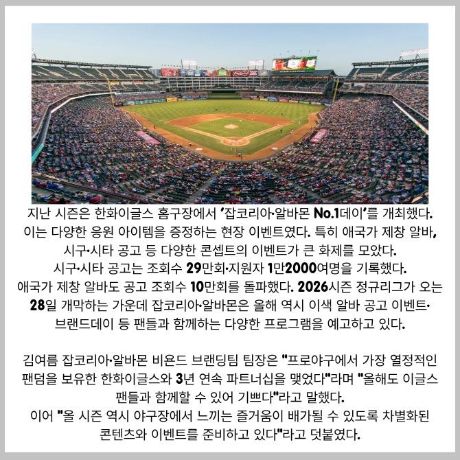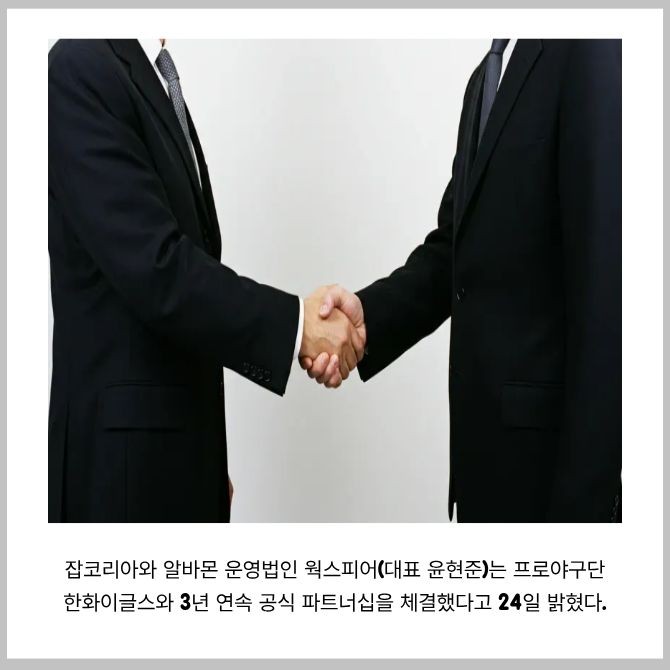[프라임경제] 웍스피어(대표 윤현준)는 산하브랜드 잡코리아·알바몬 브랜드 홍보를 위해 한화이글스와 3년 연속 공식 파트너십을 체결했다고 24일 밝혔다.