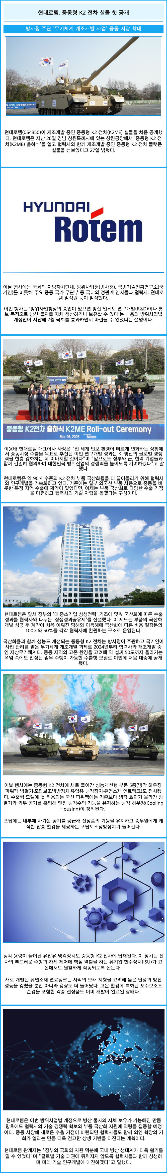 [프라임경제] 현대로템(064350)이 개조개발 중인 중동형 K2 전차(K2ME) 실물을 처음 공개했다. 현대로템은 지난 26일 경남 창원특례시에 있는 창원공장에서 '중동형 K2 전차(K2ME) 출하식'을 열고 협력사와 함께 개조개발 중인 중동형 K2 전차 플랫폼 실물을 선보였다고 27일 밝혔다.