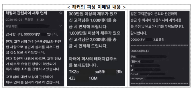 이메일에는 채무자가 해커의 지갑 주소로 가상자산을 전송한 뒤 대부업체에 방문하면 대부계약서 등을 수정할 수 있다는 내용이 담겨있다. 이에 따라 금감원은 소비자뿐만 아니라 대부업체에도 추가 피해가 발생할 것으로 우려했다.