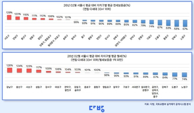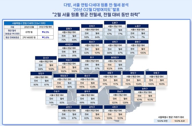 부동산 플랫폼 다방이 국토교통부 실거래가 바탕으로 서울 25개 자치구 연립·다세대 원룸 전월세 수준을 분석한 '2월 다방여지도'에 따르면, 보증금 1000만원 기준 서울 원룸 평균 △전세 보증금 2억1469만원 △월세 67만원이다. 이는 전월 대비 각각 △전세보증금 0.8%(172만원) △월세 4.5%(3만원) 하락한 수치다. 서울 평균 전세보증금과 월세가 동시에 하락한 건 지난해 10월 이후 4개월 만이다.