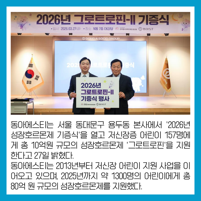 [프라임경제] 동아에스티(170900)는 서울 동대문구 용두동 본사에서 '2026년 성장호르몬제 기증식'을 열고 저신장증 어린이 157명에게 총 10억원 규모의 성장호르몬제 '그로트로핀'을 지원한다고 27일 밝혔다.