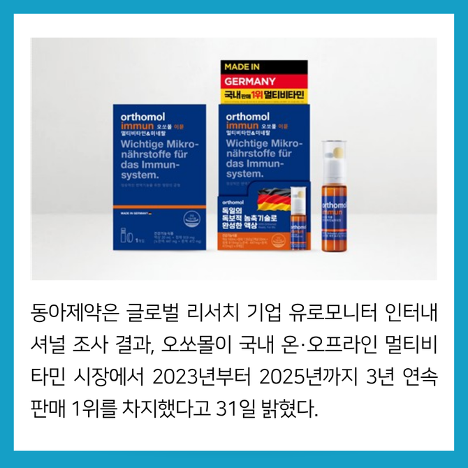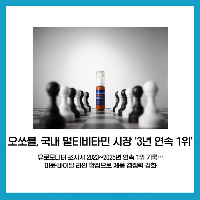 [프라임경제] 동아제약은 글로벌 리서치 기업 유로모니터 인터내셔널 조사 결과, 오쏘몰이 국내 온·오프라인 멀티비타민 시장에서 2023년부터 2025년까지 3년 연속 판매 1위를 차지했다고 31일 밝혔다.