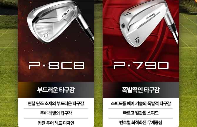 P·790 아이언은 번호별 최적화된 헤드 설계와 '스피드폼 에어' 기술을 적용해 폭발적인 타구감과 향상된 퍼포먼스를 제공하고, P·8CB 아이언은 투어 DNA에 높은 관용성을 더한 단조 아이언으로, 1025 연철 기반의 초고밀도 단조 공정을 통해 부드러운 타구감과 안정적인 샷 구현을 돕는다.